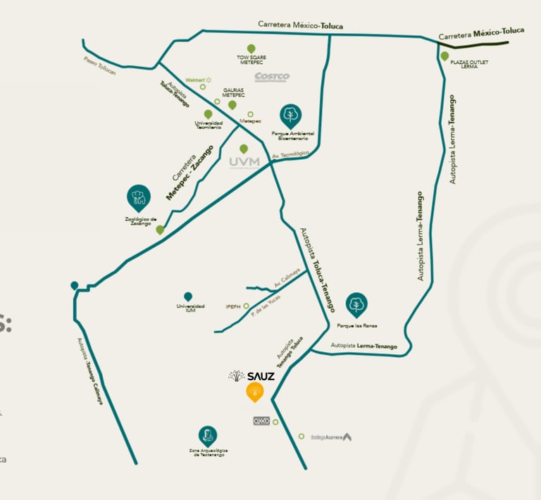 Sauz es más que un lugar para vivir; es donde diseño, naturaleza y comodidad se unen. Ubicado a solo 45 min de la Ciudad de México y 15 min de Metepec.